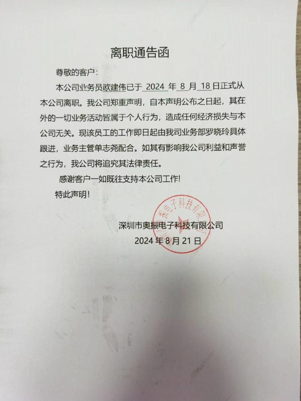 本公司業(yè)務(wù)員歐建偉已于2024年8月18日正式從本公司離職。我公司鄭重聲明,自本聲明公布之日起,其在外的一切業(yè)務(wù)活動皆屬于個人行為,造成任何經(jīng)濟損失與本公司無關(guān)?,F(xiàn)該員工的工作即日起由我司業(yè)務(wù)部羅曉玲具體跟進,業(yè)務(wù)主管單志堯配合。如其有影響我公司利益和聲譽之行為,我公司將追究其法律責(zé)任。